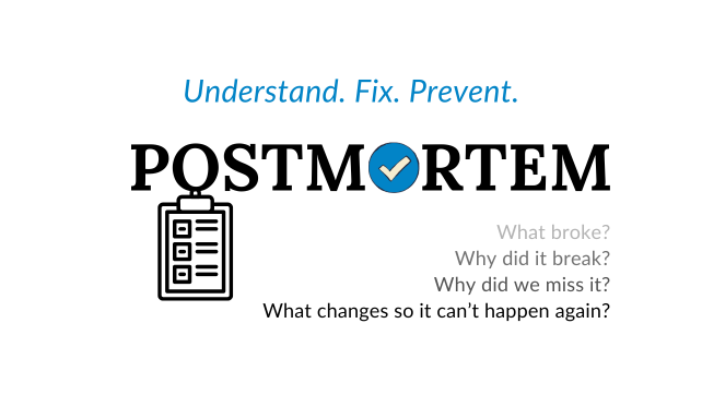A postmortem gives us a chance to move beyond “what broke?” and ask “why?”. A well-analyzed and clearly communicated postmortem helps ensure we do not make the same mistake twice.